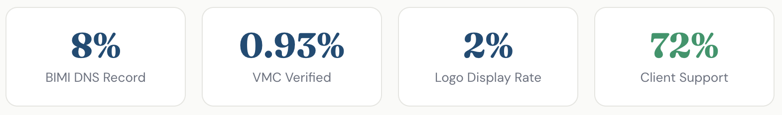 - 2% BIMI adoption. Only 0.93% have VMC-verified logos.